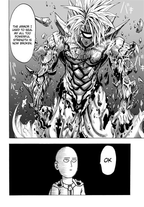 Saitama throws a swift punch at Boros, disgusted that Boros would go through all of that just to find a worthy opponent. However, the punch does not kill Boros, but instead shatters his restraining armor, which was used to seal his own power. Boros explains that Saitama has broken his armor to which Saitama responds with an OK. Boros starts to transform into his released form and charges at Saitama.